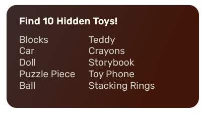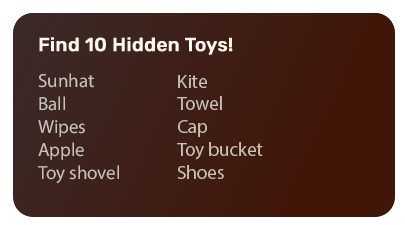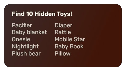How fast can you spot all the items? From playtime to bedtime, everyday moments are full of tiny discoveries. Ready for the challenge? Let’s see what you find!
